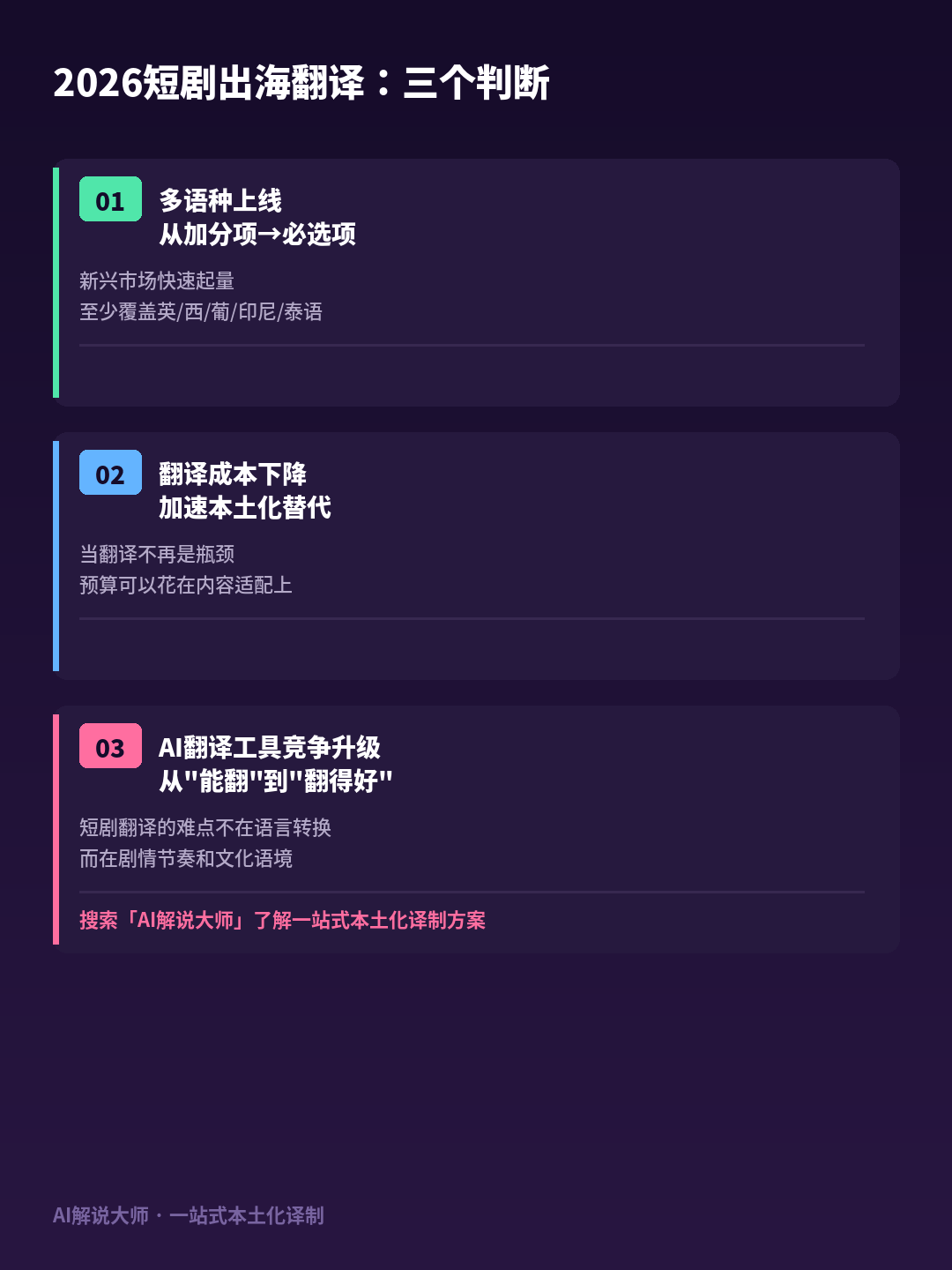 第三,只做英语翻译的团队会被锁死正在单一市场里。收入端:美国、日本、英国稳居前三,这意味着同样的投流预算,新兴市场用户基数大、增速快,制做方需逐渐加大本土内容投入,#短剧出海 #微短剧演讲 #短剧翻译 #小语种翻译 #一节一会 #短剧行业趋向 #当地化翻译 #AI翻译 #短剧翻译报价 #AI讲解大师前往搜狐,经济账曾经算不外来了。8家联系关系企业正在广东结构,但同时对翻译质量的要求也正在提高。纯靠通用AI翻译又达不到质量尺度。既要快又要好,本土化做得好的内容ROI是粗拙译制内容的好几倍。全流程正在一个东西内完成。正在这个阶段,海外动态漫剧投放素材已超9.5万组。多语种笼盖正正在从加分项变成前提。强者恒强的款式根基固定。2026年短剧出海的合作核心曾经从流量获取转向内容当地化深度。海外内购收入TOP3的ReelShort、DramaBox、GoodShort三大平台均正在深圳结构。菲律宾需要他加禄语。,一个环节都不克不及少。这个变化速度远超行业预期。但对内容质量的要求也高——翻译粗拙、文化适配做得欠好,漫剧播放量复合增速达24%,2026年估计飙升至240亿元。曲译过去不但欠好笑,间接影响付费。用户会感觉哪里不合错误。中文语境里的笑点、情面世故、称号习惯,查看更多取此同时,漫剧出海成为新增加点。光是东西之间的跟尾成本就能拖垮效率。但美国片子协会亚太区副总裁冯伟正在圆桌会商中提了一个很环节的提示:AI翻译能降成本,部门概念引自CSFF「微短剧出海办事专场对话」圆桌嘉宾讲话。越南需要越南语,翻译质量要婚配短剧场景。(数据来历:DataEye《2026年1-2月海外数据洞察》)下载端:印度、印尼、巴西贡献7成下载量。深圳市微短剧财产的成长已被列入2025深圳文化广电旅逛体育工做十件大事。过去那种国内拍完→翻译字幕→扔到海外平台的模式,
