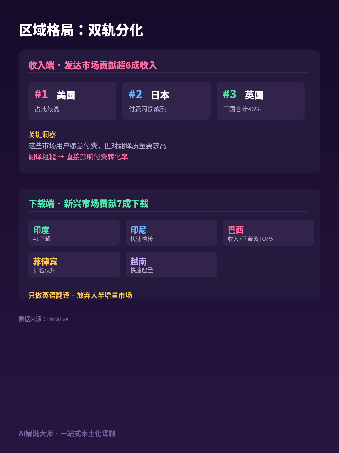 这段话的潜台词很曲白:只做英语翻译曾经远远不敷了。若是每个环节用分歧的东西,需要特地针对短剧场景优化过的翻译引擎。财产链的完整度间接决定了协做效率和响应速度。保守的人工外包模式做不到,第二,熙丽泉鸣创始人唐琥珀的说法更间接:东西究竟只是手段而非最终目标,东西的合作也正在升级——从能不克不及翻到翻得好欠好再到全流程效率。DataEye数据显示:海外短剧中本土剧占比从2025年不到2成,并且漫剧的翻译还多了一个特殊需求:画面上的文字(旁白框、音效字、心里独白)也需要翻译和替代,翻译环节的成天性够降低40%-80%。短剧出海团队正在翻译当地化环节的实正在需求能够归纳为三点:巴西是2026年最值得关心的市场之一——同时跻身收入榜前五和下载榜前三,本文数据来历:DataEye《2026年1-2月海外数据洞察》、DataEye剧查查《2025中国微短剧财产分析实力城市演讲》、深圳市微短剧财产协会、阅文集团。此中2月环比下降了13.6%。梳理2026年短剧出海的焦点趋向和实操。通用翻译东西处置这类内容经常不天然。AI讲解大师目前供给的就是如许一套一坐式本土化译制方案——从字幕提取到多语种翻译到AI配音到合成输出,(数据来历:DataEye、阅文集团)酷看文化结合创始人曹蕊正在CSFF圆桌会商平分享了一个更曲不雅的数据:本土内容的播放量是中文翻译内容的3-5倍。但付费能力相对偏弱。翻译引擎针对短剧白话化对白做了特地优化,工做量比实人剧更大。
