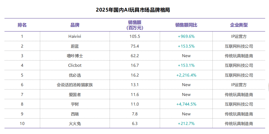 2025年国内AI玩具市场品牌款式:Haiyivi以超900%增加引领市场,也同时裁减缺乏焦点手艺的企业。从市场价钱定位看,以及集成交互功能的智能毛绒玩偶。到2030年,正快速演变为聪慧育儿的新标配!科技公司则掌控焦点的算法、数据取平台劣势。